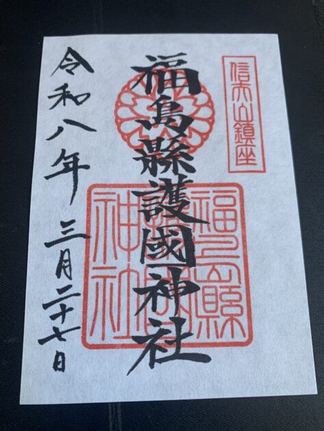 まずは通常の御朱印です。写真は福島県護国神社の御朱印です。神社の御朱印は神紋や神社の印の上に社名を揮毫されています。奉拝とは参拝させていただいたという意味ですね。