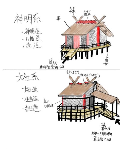 神明造、大社造とも何も塗られていない素木がつかわれ、図にある千木と鰹木が屋根の上に設けられています。伊勢神宮のような掘立柱と茅葺屋根を唯一神明造といいます。