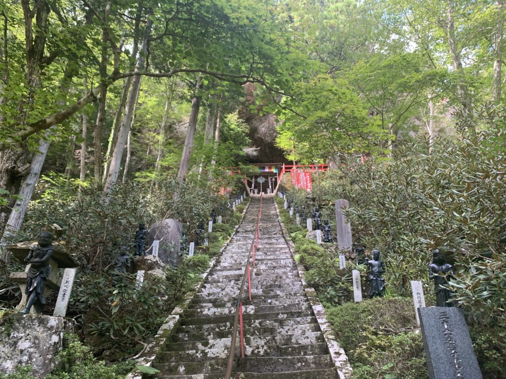 奥の院は護摩堂から続く長い道と階段をのぼり行くことができます。階段をいったん降りて川が流れる橋を渡っていくと奥の院に続く階段が見えてきます。奥の院最後の階段はなんと130段あり、三十六童子が見守る中少しずつ息を切らしながら階段を上っていきました。奥の院は弘法大師が巨大な岩の霊窟に不動明王を納められ、そこに社が建っております。息を整えつつ祈ることができました。